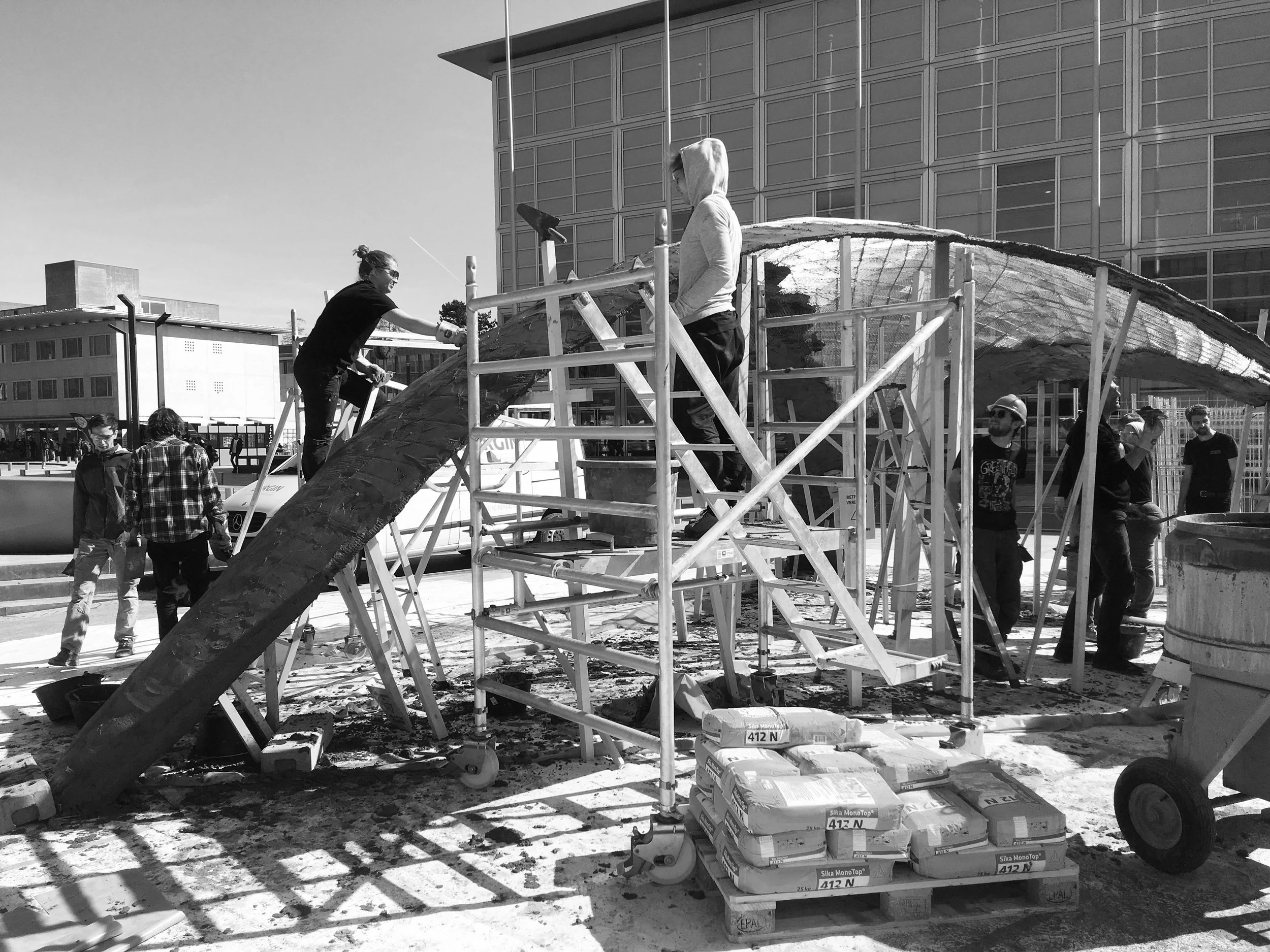 Using the ETH archive the work of Heniz Isler was researched. A suspended catenary plaster model was made to find form. This was then 3D scanned, scaled and structurally analysed. Technical drawings were then made to instruct the bending of the rebar. The rebar was then welded into position. After wrapping this in mesh to create a lattice structure the process of applying the reinforced concrete could be applied.